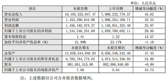報告期內(nèi),公司實現(xiàn)營業(yè)總收入10,193,552,047.47元,較上年同期增長45.62%,主要系隨著公司品牌影響力不斷提升,產(chǎn)品銷量同比增長,材料銷售業(yè)務(wù)和施工服務(wù)業(yè)務(wù)規(guī)模均有所增長所致;營業(yè)利潤1,453,296,644.08元,較上年同期增長32.53%,利潤總額1,456,182,973.27元,較上年同期增長25.87%,歸屬于上市公司股東的凈利潤1,244,246,251.68元,較上年同期增長20.95%,基本每股收益1.41元,較上年同期增長15.57%,主要原因是報告期公司營業(yè)狀況整體向好,主要產(chǎn)品的銷售收入、施工收入繼續(xù)增加,毛利潤逐步提高所致。報告期公司財務(wù)狀況良好,截止2017年12月31日,公司總資產(chǎn)13,058,544,946.03元,較本報告期初增長了47.45%,主要是公司經(jīng)營規(guī)模擴大所致。