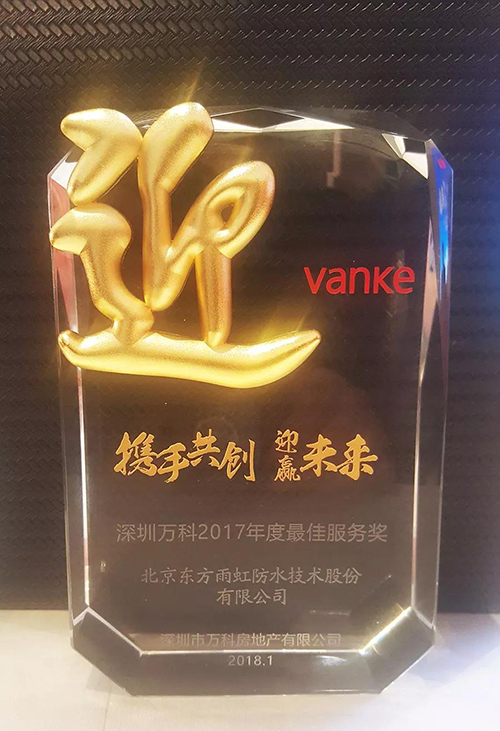 1月25日,深圳萬科2018年度供方春茗會(huì)暨2017年度工程評(píng)估總結(jié)會(huì)在南山前海萬科企業(yè)公館召開。會(huì)上為深圳萬科的合作伙伴頒發(fā)了年度優(yōu)秀服務(wù)獎(jiǎng),東方雨虹榮譽(yù)上榜。