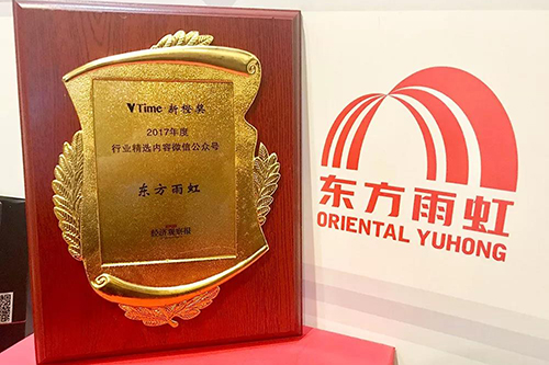 VTime·新橙獎評選致力于發(fā)現(xiàn)中國微信公眾號領(lǐng)域中有著突出特點,能夠在激烈的市場競爭中長期保持優(yōu)質(zhì)用戶體驗和高度用戶粘性的優(yōu)秀賬號。從社會價值、品牌價值、服務(wù)價值、傳播價值、關(guān)注度、前瞻性、影響力、文章閱讀量等方面對微信公眾號進行綜合考量。   2017年,東方雨虹公眾號先后推出過關(guān)于企業(yè)文化、優(yōu)秀雨虹人、奮斗精神、工廠建設(shè)、人文環(huán)境、學(xué)習(xí)、創(chuàng)新、新聞動態(tài)、經(jīng)典工程、虹遍中國等不同方面的策劃。力求從各個角度展現(xiàn)企業(yè)形象和員工風(fēng)貌,以小見大,從細節(jié)之處展現(xiàn)東方雨虹對于卓越品質(zhì)的不懈追求。   此次獲獎,是從專業(yè)層面對“東方雨虹”企業(yè)微信號綜合實力和價值的肯定。未來,東方雨虹將致力于提供更及時的企業(yè)資訊和更豐富的內(nèi)容,為讀者帶來更好的用戶體驗。