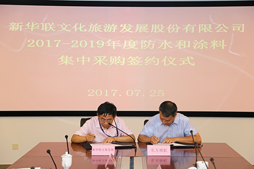 7月25日,新華聯文化旅游發展股份有限公司2017-2019年度防水和涂料集中采購簽約儀式在北京臺湖新華聯總部召開,包括東方雨虹在內的五家涂料和防水供應商代表受邀參加。新華聯集采中心總監彭建奇主持儀式,東方雨虹集團副總裁張洪濤參加簽約儀式并發言。
