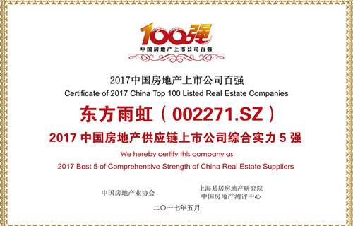 5月25日,“2017中國房地產(chǎn)上市公司測評成果發(fā)布會暨上市房企高峰論壇”在香港舉行。會上,中國房地產(chǎn)業(yè)協(xié)會、中國房地產(chǎn)測評中心發(fā)布了《2017中國房地產(chǎn)上市公司測評研究報告》。根據(jù)報告,東方雨虹獲評“2017中國房地產(chǎn)供應(yīng)鏈上市公司綜合實力5強”。