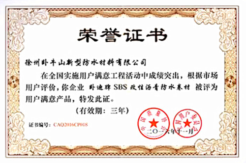 臥迪牌SBS改性瀝青防水卷材獲“2016年全國用戶滿意產品”