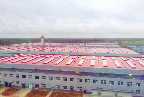 該項目位于黑龍江省齊齊哈爾市,東方雨虹承擔其一期農機具聯合廠房、輪拖聯合廠房及調試車間屋面防水工程,施工面積共計約七萬平方米,于2011年9月竣工。 為滿足業主方整體廠房設計規劃色調的需求,東方雨虹TPO事業部特意為此項目定制了與其企業文化相吻合的緋紅色熱塑性聚烯烴(TPO)防水卷材,是當時國內較早的彩色TPO項目,如今五年過去了,依舊亮麗如新。