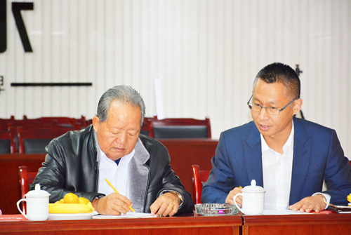 老撾原中央政治局常委、副總理阿?!诶铮ㄗ螅L行防水總經理呂學強(右)