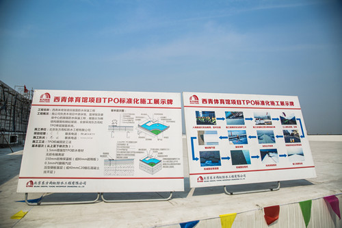 會(huì)議結(jié)束后,雙方一起參觀了天津市西青體育館施工現(xiàn)場(chǎng),易帥就施工要點(diǎn)及細(xì)部節(jié)點(diǎn)為設(shè)計(jì)師們進(jìn)行逐一講解,得到了院方對(duì)東方雨虹TPO單層屋面防水系統(tǒng)的認(rèn)可,為雙方進(jìn)一步開(kāi)展友好交流合作奠定了基礎(chǔ)。