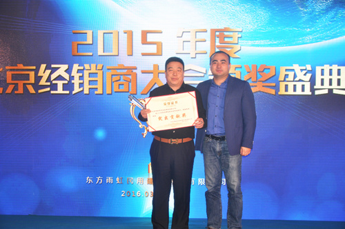 東方雨虹民建公司總經理熊俊先生首先發表致辭,他表示建材行業正在進行新一輪的洗牌,三無產品、小品牌將被淘汰出局。2016年,東方雨虹將繼續發揮品牌優勢,用專業和規范引領行業發展,砥礪前行,營造新的市場局面。   會議安排2015年度北京優秀經銷商表彰環節,設置突出貢獻獎、10年忠誠客戶獎、優秀合作獎等7個獎項, 有20余位經銷商獲獎。