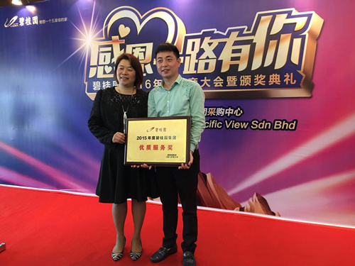 2016年3月10日,碧桂園2016年供應商大會在馬來西亞碧桂園森林城市召開,此次大會主要評估2015年碧桂園供應商服務質量。據悉,碧桂園集團的供應商多達15900余家,本次表彰的是其中優秀的60余家。東方雨虹憑借優質的產品和出色的服務脫穎而出,榮獲2015年度碧桂園優質服務獎。