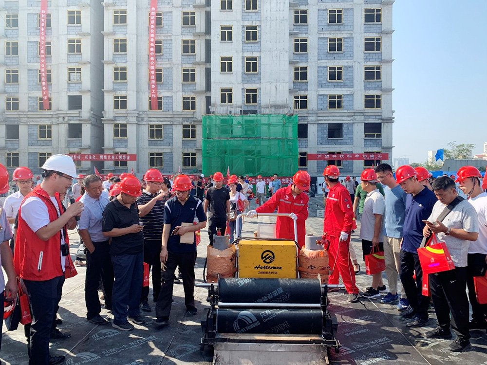 觀摩會(huì)現(xiàn)場,東方雨虹工建集團(tuán)大鄭州區(qū)域總經(jīng)理朱新峰表示,濮陽東方雨虹生產(chǎn)基地的建立,立足本地,輻射并滿足周邊區(qū)域的防水需求,全面踐行“為人類為社會(huì)創(chuàng)造持久安全的環(huán)境”使命;工建集團(tuán)大鄭州區(qū)域技術(shù)副總工程師孫新磊向與會(huì)人員展示了東方雨虹各業(yè)務(wù)領(lǐng)域的高質(zhì)量產(chǎn)品和標(biāo)準(zhǔn)化施工流程,現(xiàn)場操作“虹人”“騎行者”等機(jī)械化設(shè)備,闡述了新型材料的優(yōu)勢和使用范圍。