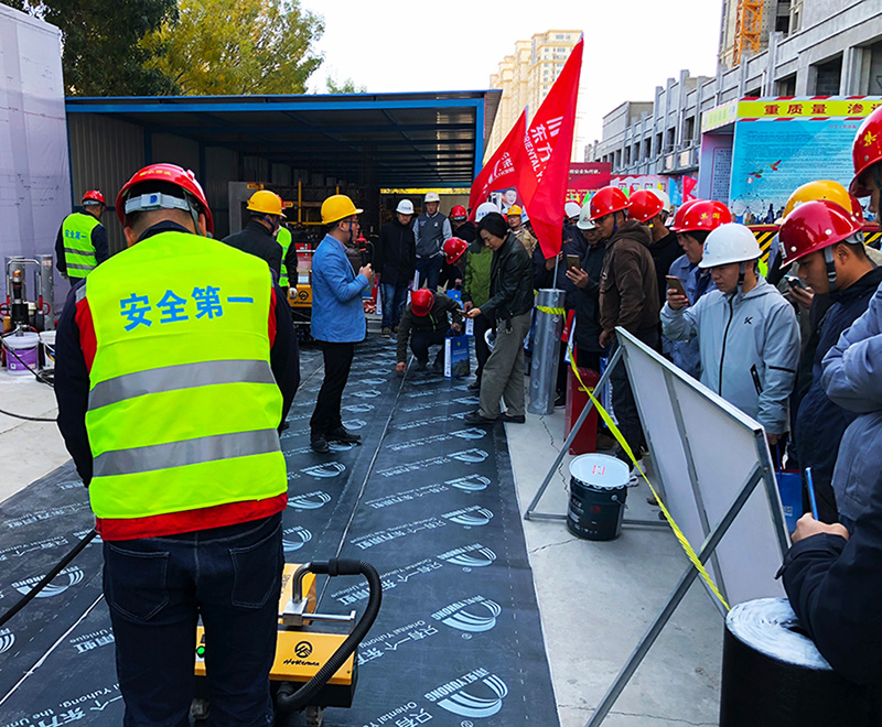 會上,東方雨虹對近幾年被廣泛應用于現代建筑中的非固化復合防水體系的產品特點和施工工藝進行詳細講解。為了提高建筑防水施工效率,并減少人為因素造成的誤差,東方雨虹技術人員現場展示了“虹人”智能型熱熔防水卷材攤鋪機車“坦途”和“騎行者”在平面熱熔滿粘施工和熱熔瀝青卷材搭接邊焊接中的應用。