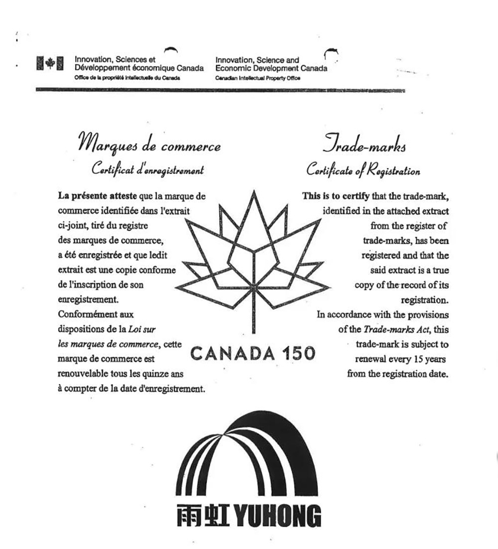 日前,公司收到由隸屬加拿大創新、科技及經濟發展部(Innovation, Science and Economic Development Canada)的加拿大知識產權局(Canadian Intellectual Property Office)頒發的“雨虹”加拿大商標注冊證書,其商標保護范圍覆蓋瓷磚膠、涂料、砂漿、防水卷材、建筑工程服務等公司主營業務的全部品類。