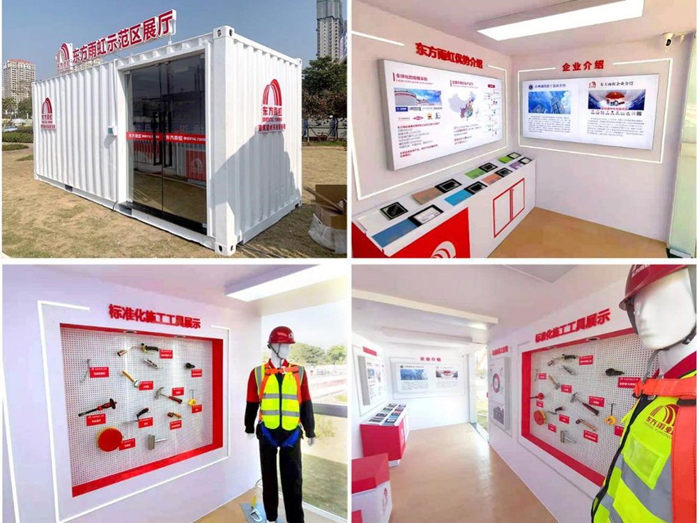 該項(xiàng)目以白色集裝箱為主體,運(yùn)輸方便靈活,便于吊裝到其他工地項(xiàng)目;其內(nèi)部采用了圖文、實(shí)物和模型(沙盤)等多種形式,對東方雨虹的企業(yè)形象、建筑建材、產(chǎn)品體系、標(biāo)準(zhǔn)化施工等情況進(jìn)行重點(diǎn)展示。