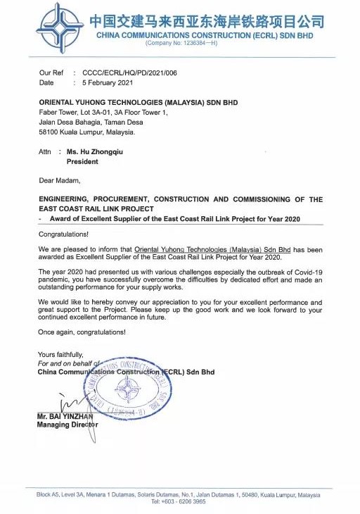 日前,東方雨虹(ORIENTAL YUHONG)喜獲2020年中國交建馬來西亞東海岸鐵路項目總經(jīng)理部年度優(yōu)秀供應(yīng)商稱號。