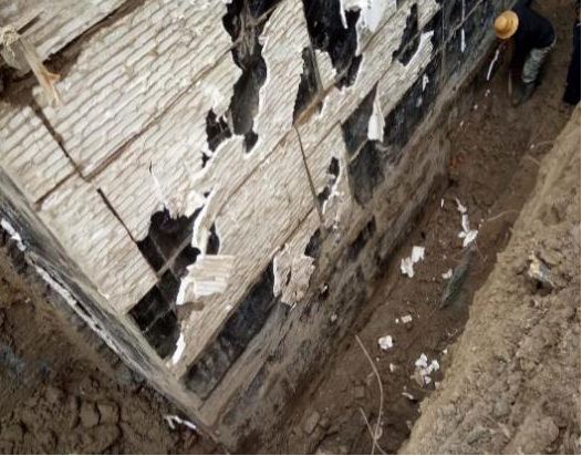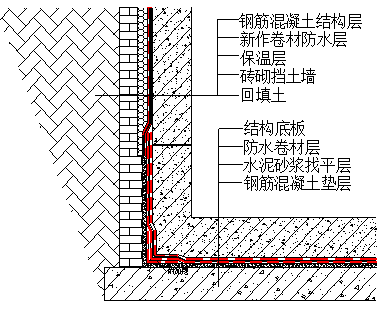 2. 在墻面涂刷基層處理劑,重新鋪貼卷材防水層,邊恢復保溫邊砌筑擋土磚墻邊回填土方。