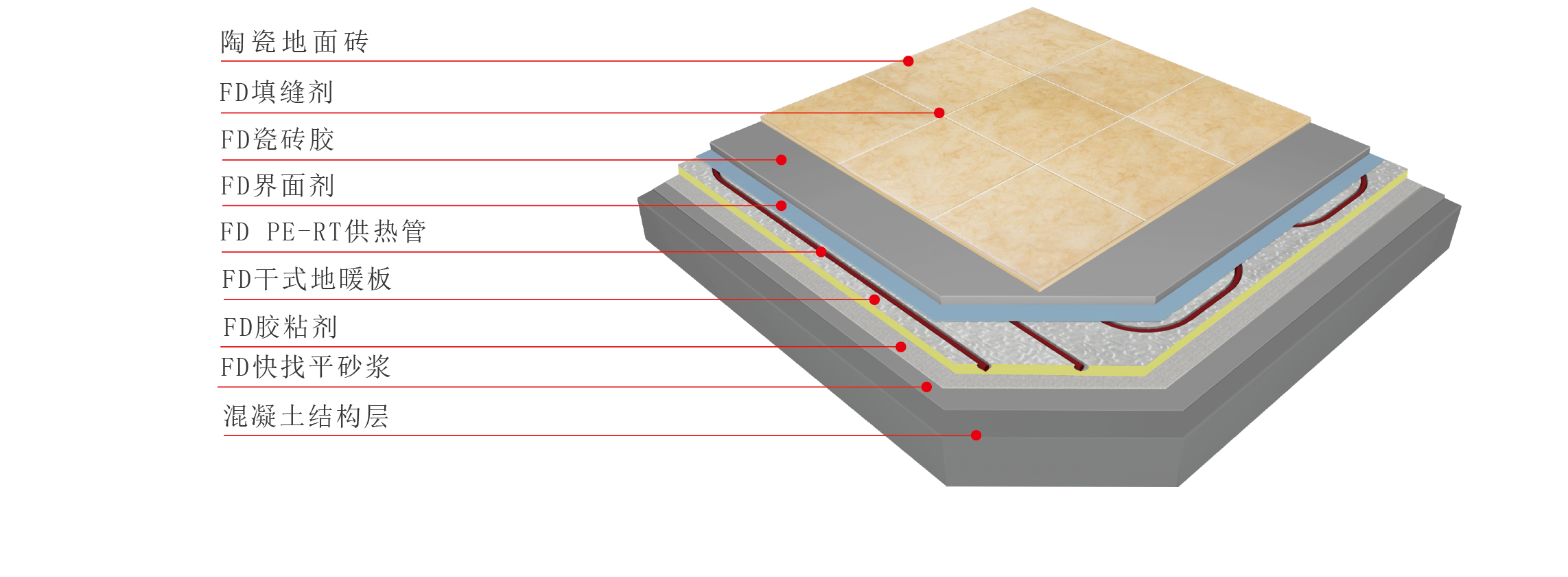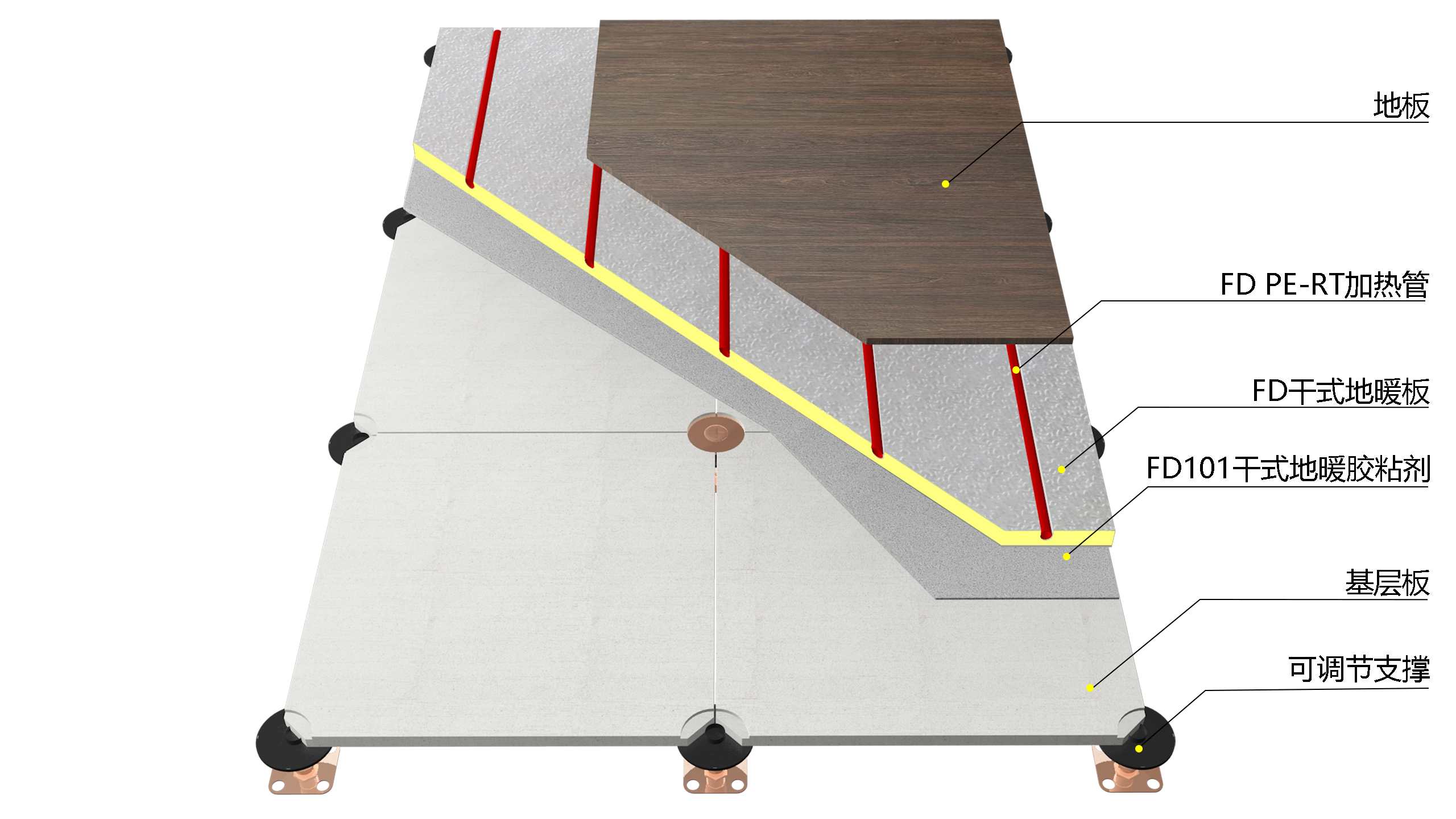 FD干式地暖系統(tǒng)是將加熱管或加熱電纜敷設(shè)在FD干式地暖板的溝槽中,不填充混凝土,直接鋪設(shè)面層的地面輻射供暖構(gòu)造。